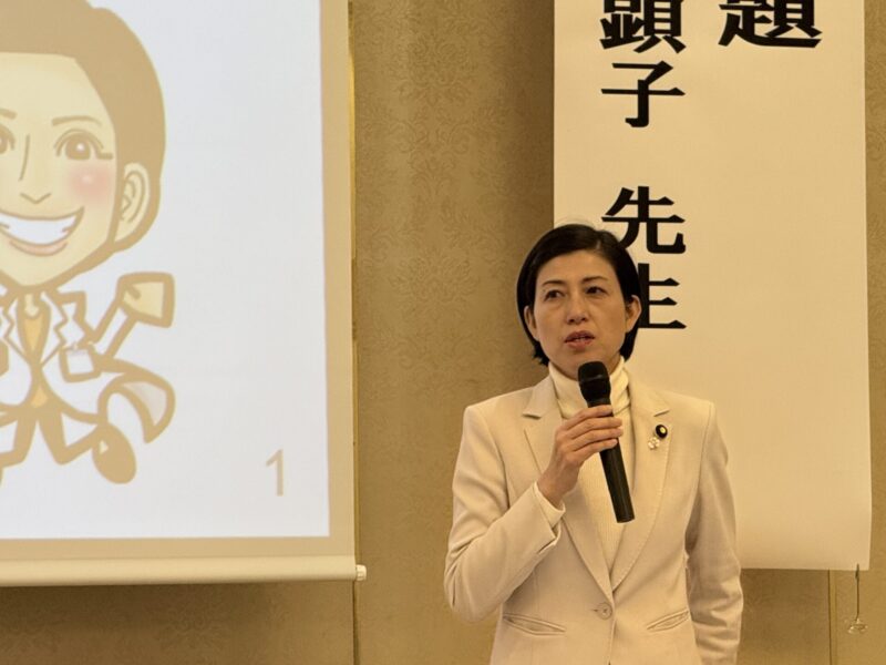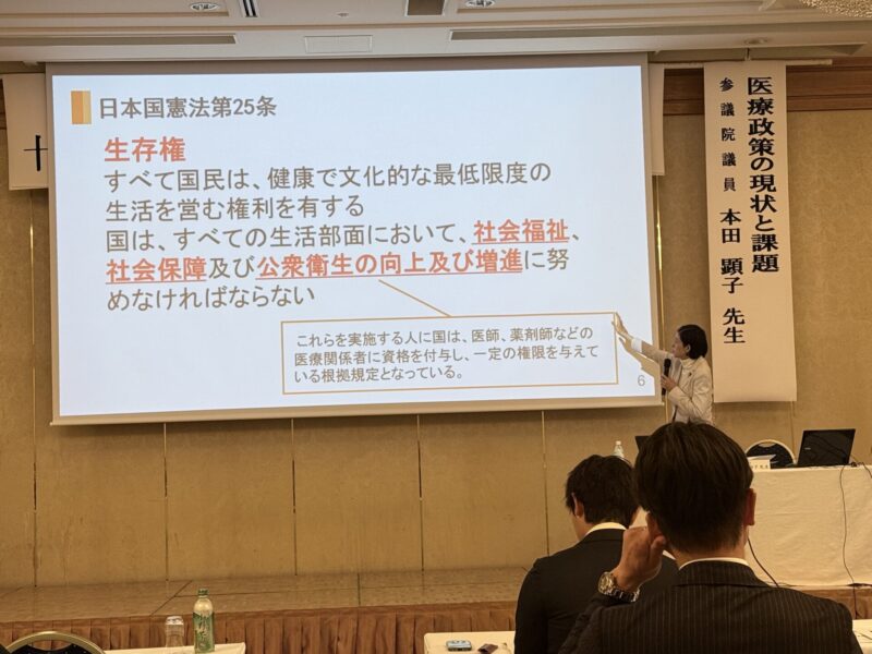 まず、主催者を代表して塾長代理 友広 巌 県連総務会長が挨拶をした後、参議院議員 本田 顕子 先生を講師にお招きし、「医療政策の現状と課題」と題して社会保障制度や医療費の問題等について、パワーポイントを使用して分かり易くご講演いただきました。