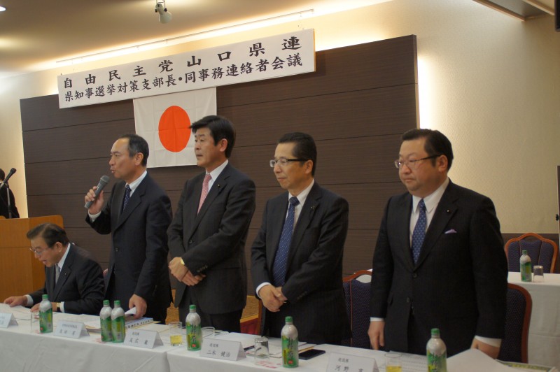 2月1日(土)17時より、山口県知事 選対支部長・同事務連絡者会議を 開催しました。 挨拶をする友田有 村岡総合選対事務局長 遊説隊(左2番目より)友広巌県議、二木健治県議、河野亨県議 (右より)岸信夫県連会長、松永卓会長代行、塩満久雄副会長 新谷和彦幹事長、藤井律子総務会長