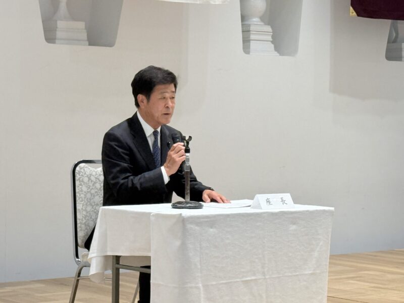 開会に先立ち、8日に施行された県知事選挙において、圧倒的な得票を得て当選された村岡嗣政県知事が挨拶をされました。
